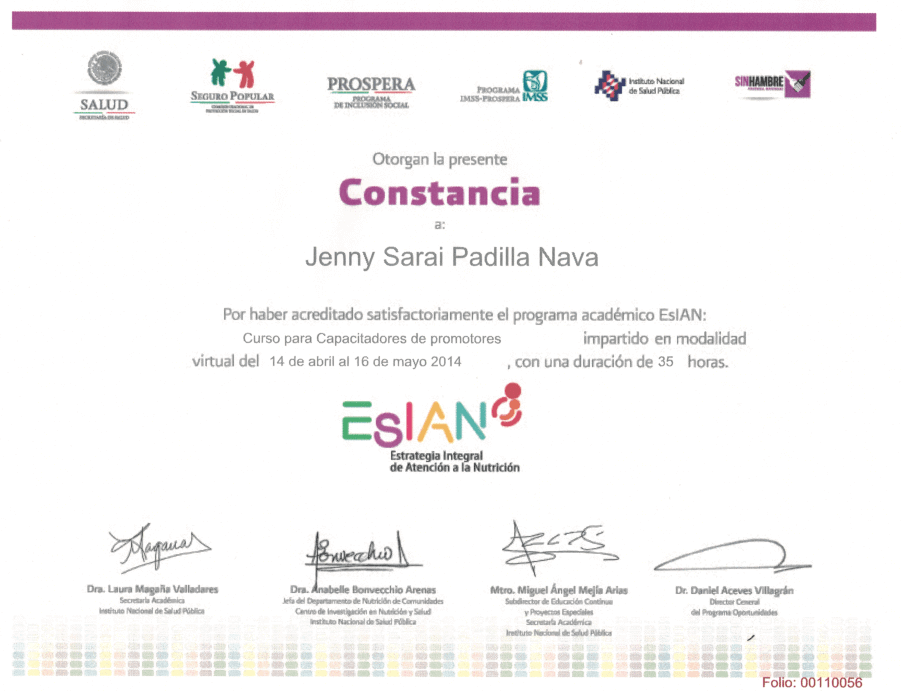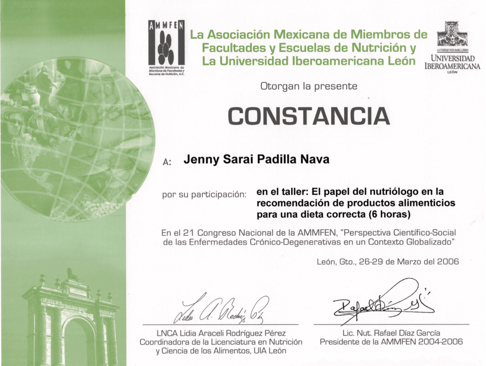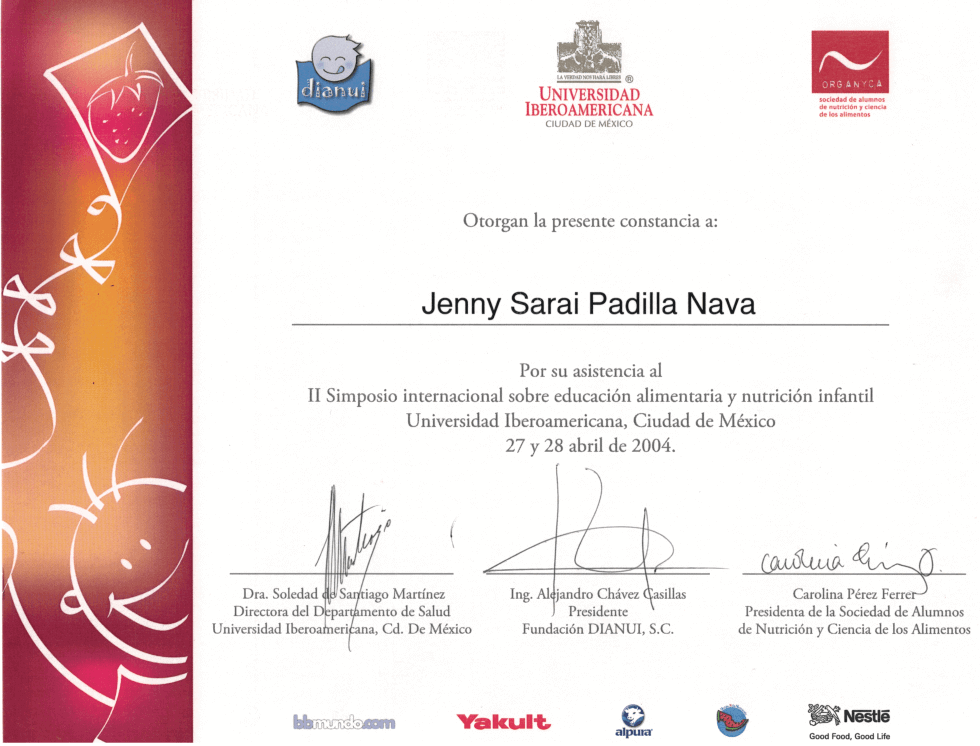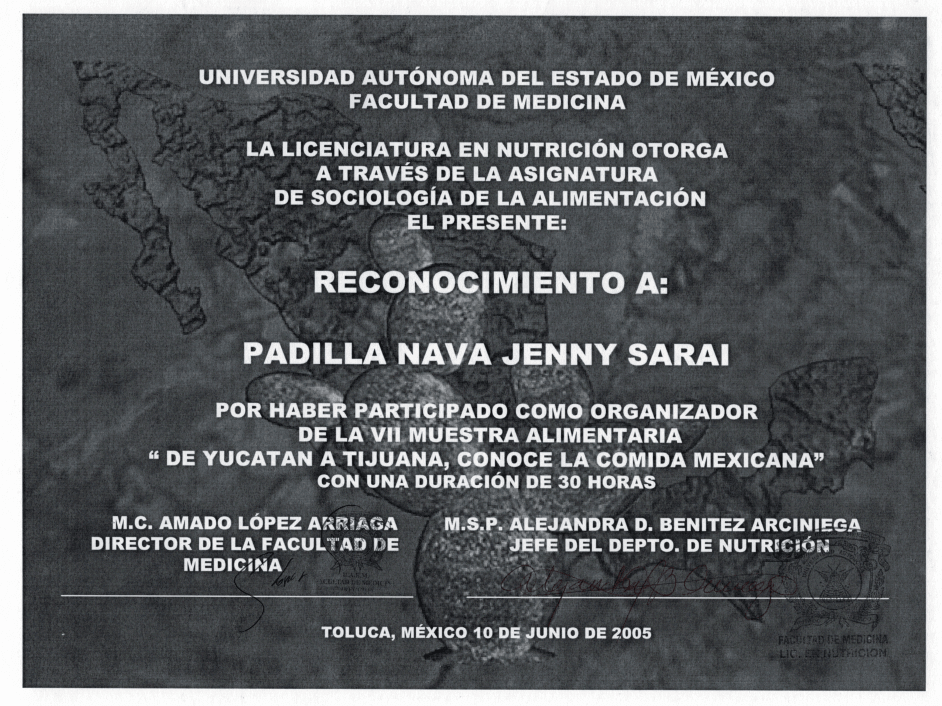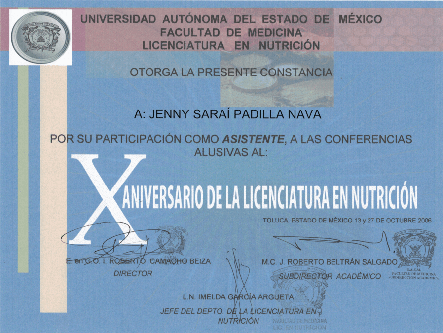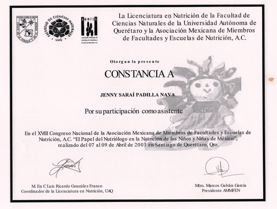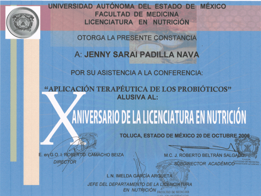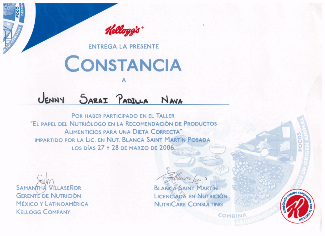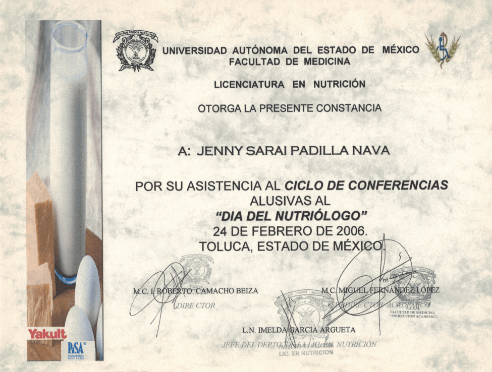 La Licenciada en Nutrición Jenny Sarai Padilla egresó de la Universidad Autónoma del Estado de México (UAEMex). Actualmente combina su labor en el sector salud, con la atención en consultorio privado, además de impartir conferencias y capacitaciones en temas de nutrición.